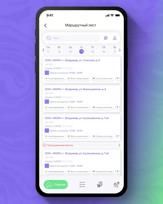 Фиксируем приход торгового агента в торговую точку по геолокации и автоматическое начало визита: система контролирует выполнение всех запланированных в рамках визита задач и собирает данные для статистики.