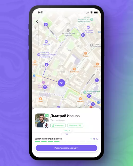 Динамические маршруты торговых агентов отображается на интерактивной карте как для самого сотрудника, так и для его супервайзера, имеющего возможность вручную вносить изменения в маршрут и контролировать местонахождение сотрудников и их перемещения в режиме онлайн.