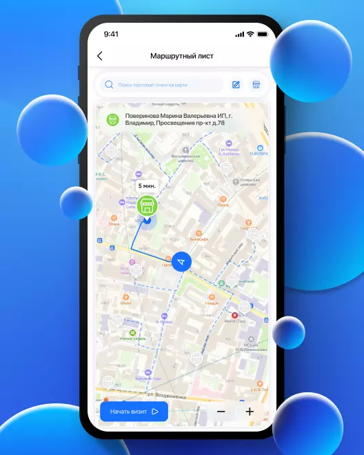 Построенный маршрут отображается на интерактивной карте как для самого сотрудника, так и для его супервайзера, имеющего возможность вручную вносить изменения в маршрут и контролировать местонахождение сотрудников и их перемещения в режиме онлайн.